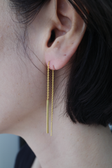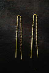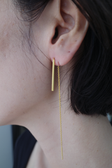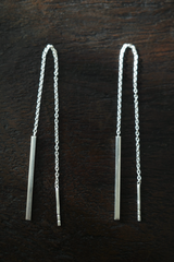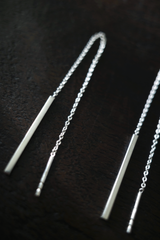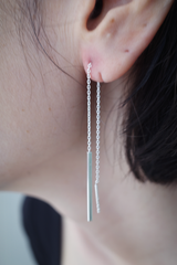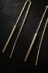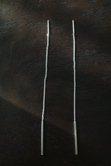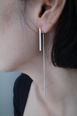 華奢なチェーンと直線的なバーが織りなす、ミニマルなピアス。耳元で繊細に揺れ、光を柔らかく反射します。チェーンの通し方によって、長さやバランスを自由に変えられるデザイン。シンプルながらも動きのある表情で、装いに軽やかなニュアンスを添えます。
