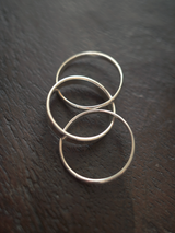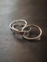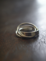 異なる太さの3本のリングを組み合わせたデザイン。ラインの重なりが生む陰影と光のコントラストが、手元に静かな存在感を与えます。ミニマルな造形の中に、わずかな動きを感じさせるバランス。シンプルでありながら、ひとつで十分な印象を持つデザインです。